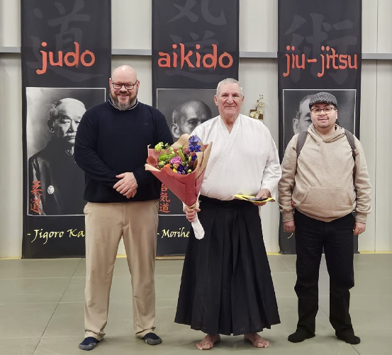 Dat konden wij natuurlijk niet aan ons voorbij laten gaan, dus hebben we Carool verrast tijdens een les en werd hij in het bijzijn van al zijn vaste Aikido-maatjes in het zonnetje gezet door het bestuur.
